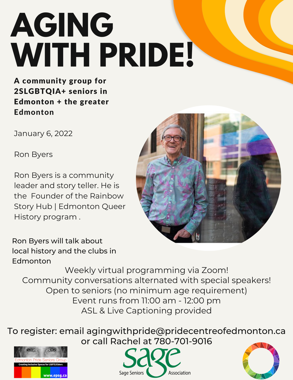 Ron will talk about local queer history and the clubs in Edmonton. He is a community leader and story teller. He is the founder of the Rainbow Story Hub / Edmonton Queer History program.